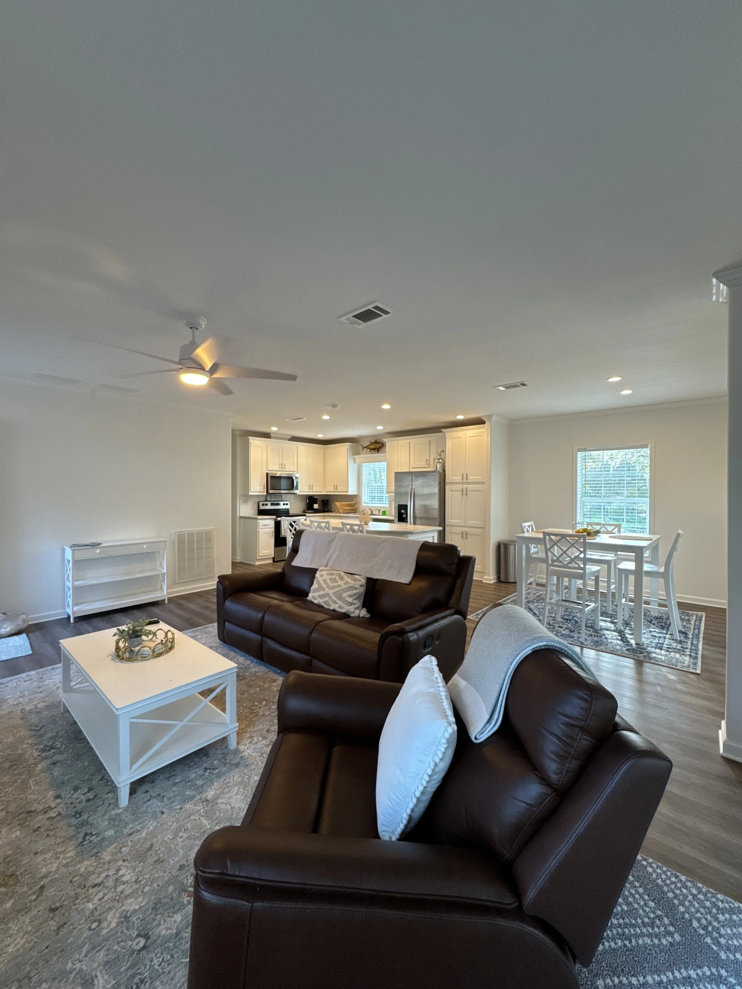 Our rental property features a spacious and modern living room designed for both comfort and style. The open floor plan allows for plenty of natural light, enhancing the clean lines and contemporary finishes throughout the space. The living area is perfect for entertaining, with ample seating options and a seamless flow into the kitchen.